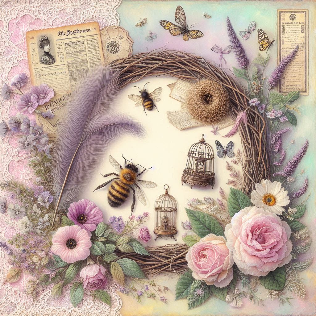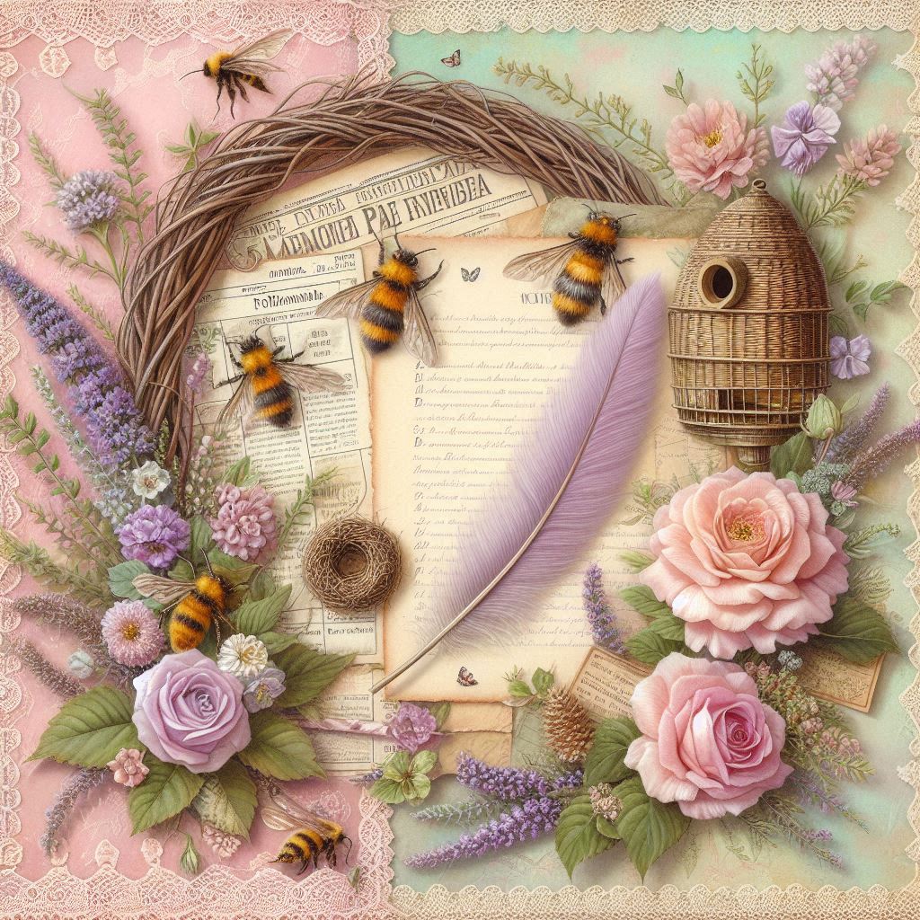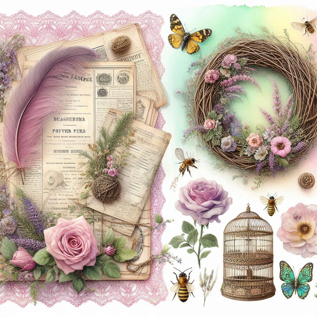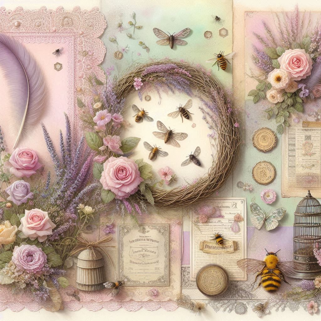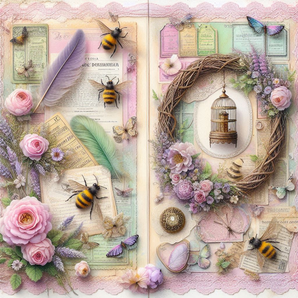 🌸 Élégance romantique : Une page en dentelle rose, agrémentée d’une plume, d’un journal vintage, de roses lavande et de potpourri délicat. 🌿 Nature en douceur : Une page crème au fond pastel aquarelle, mettant en scène un bouquet de fleurs sauvages et un nid d’oiseau dans un buisson. 🐝 Charme rustique : Une feuille d’étiquettes aux tons vert pâle et jaune, décorée d’abeilles réalistes et de ruches, encadrées par de fines brindilles. 🕊️ Ambiance victorienne : Une couronne de vigne sur un fond aquarelle pastel, avec une cage à oiseaux ancienne, des roses roses et de vieux journaux. Ajout subtil de papillons irisés pour une touche féérique.