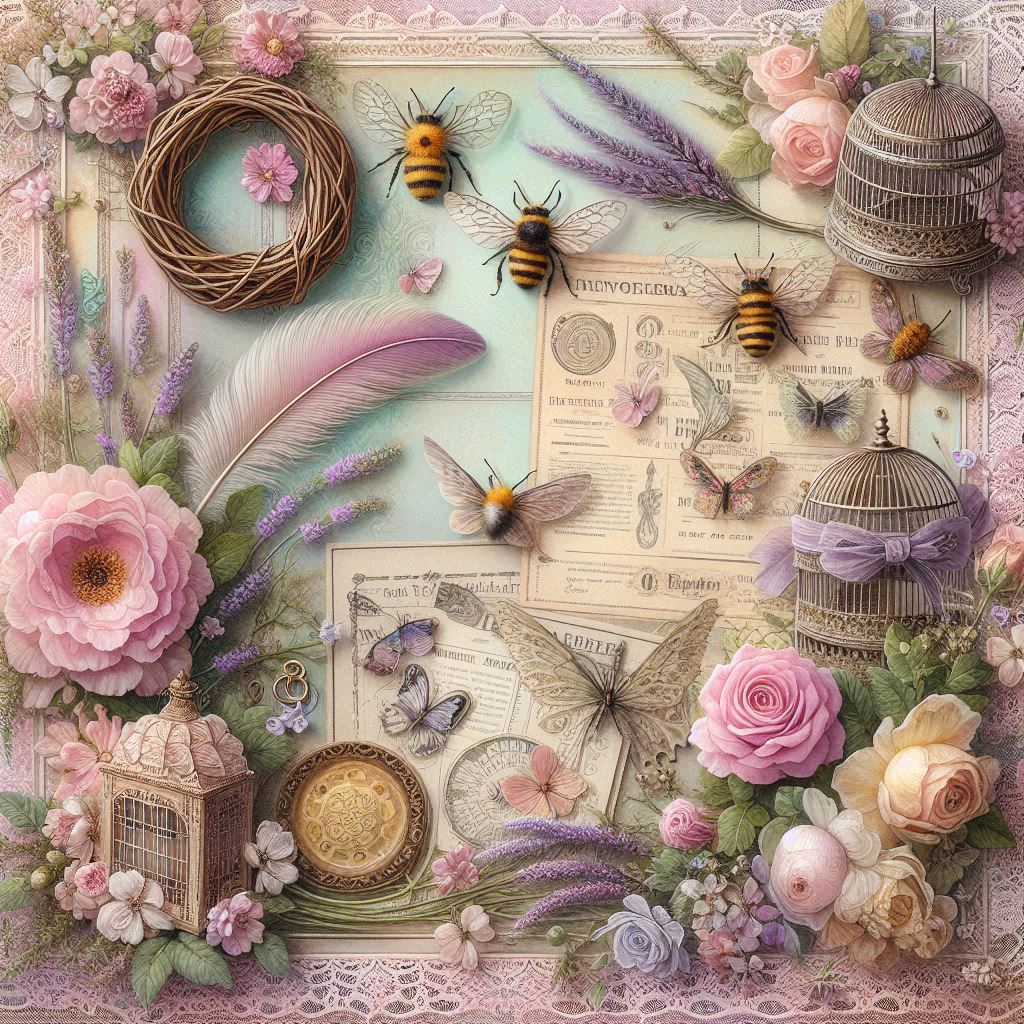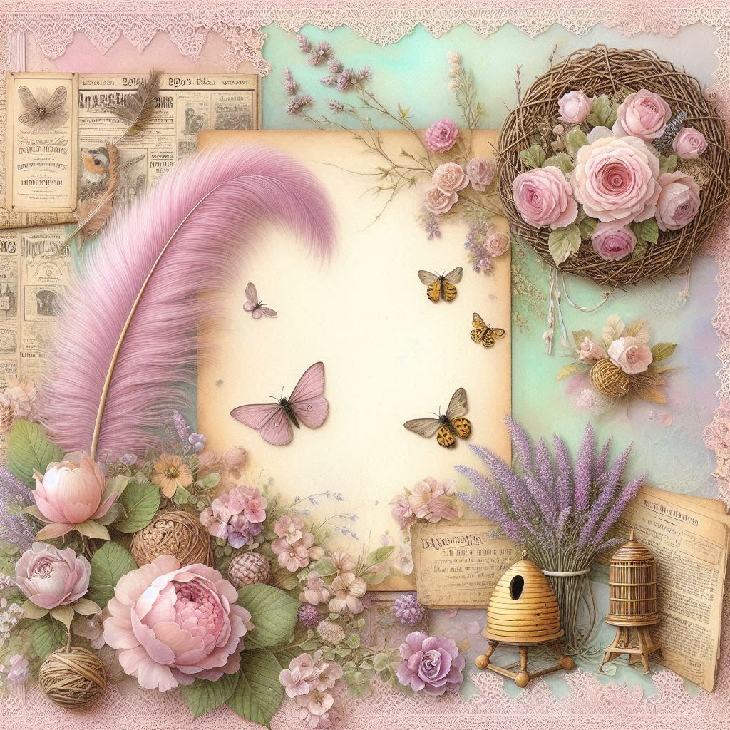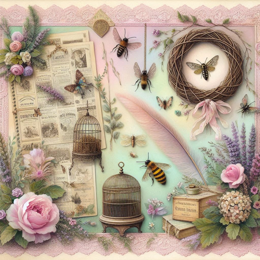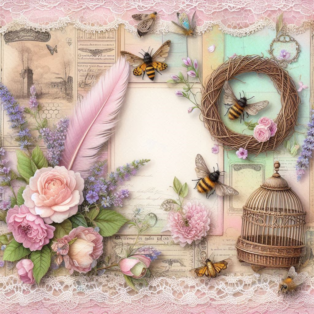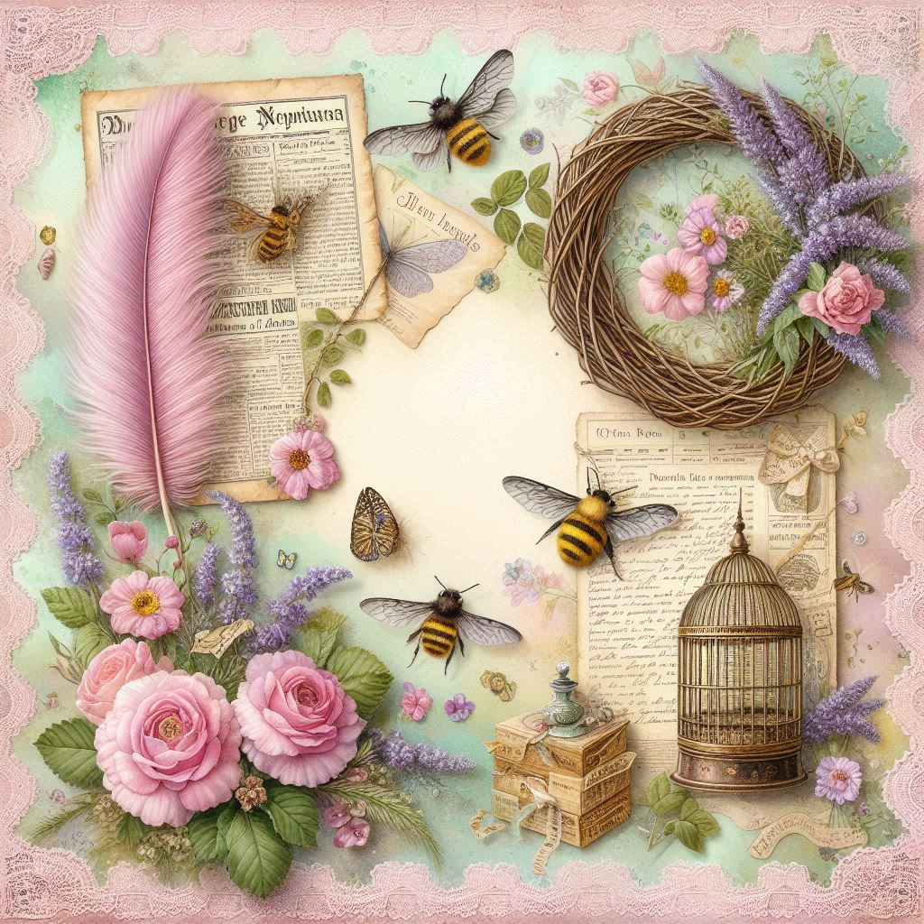 🌸 Élégance romantique : Une page en dentelle rose, agrémentée d’une plume, d’un journal vintage, de roses lavande et de potpourri délicat. 🌿 Nature en douceur : Une page crème au fond pastel aquarelle, mettant en scène un bouquet de fleurs sauvages et un nid d’oiseau dans un buisson. 🐝 Charme rustique : Une feuille d’étiquettes aux tons vert pâle et jaune, décorée d’abeilles réalistes et de ruches, encadrées par de fines brindilles. 🕊️ Ambiance victorienne : Une couronne de vigne sur un fond aquarelle pastel, avec une cage à oiseaux ancienne, des roses roses et de vieux journaux. Ajout subtil de papillons irisés pour une touche féérique.