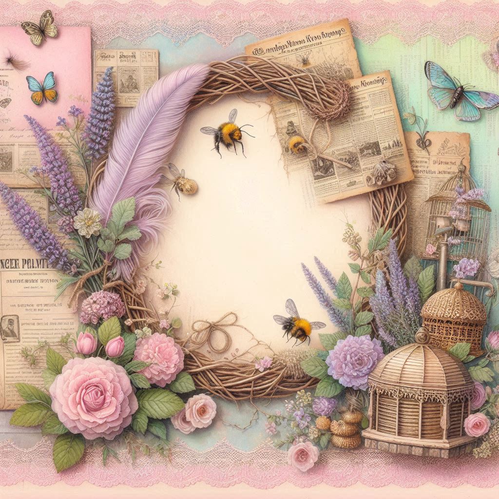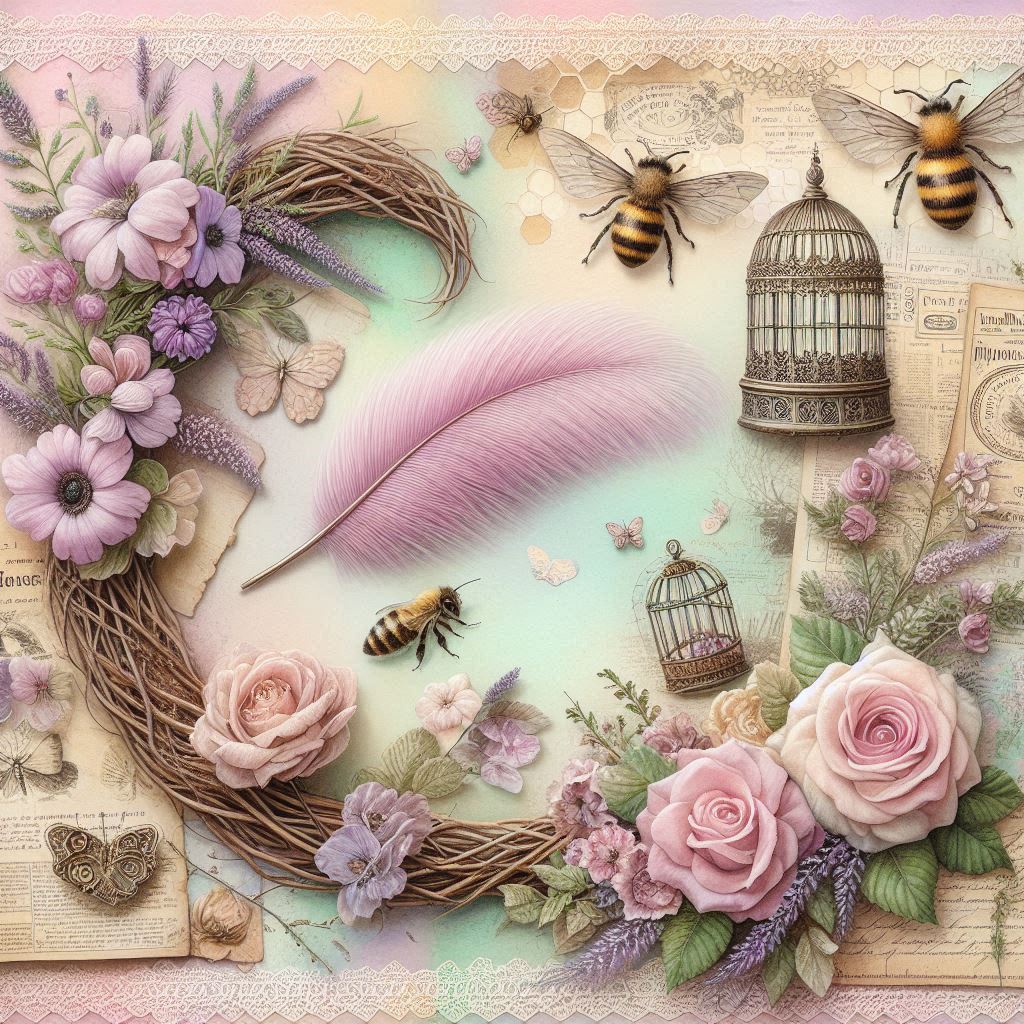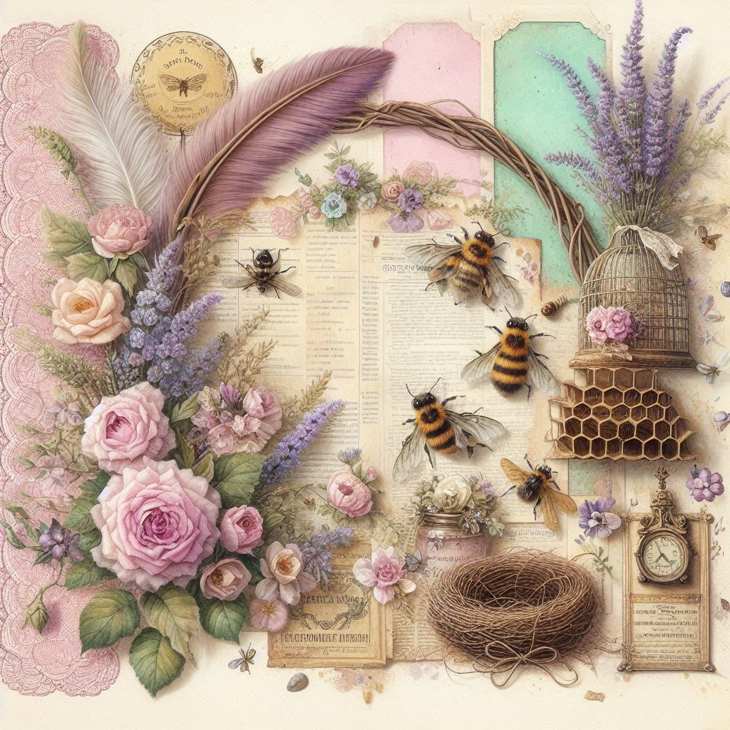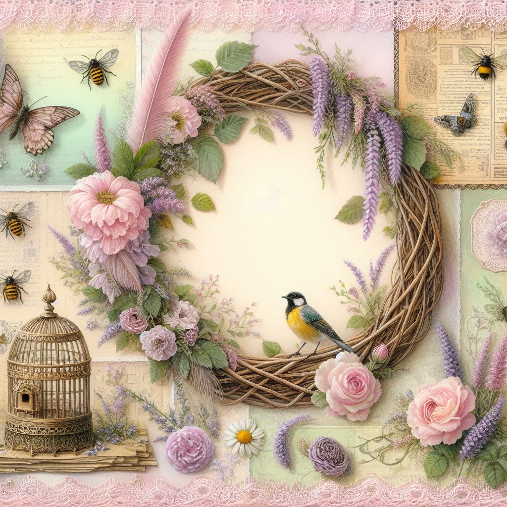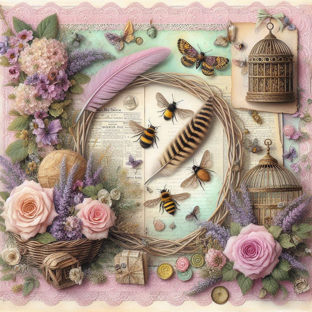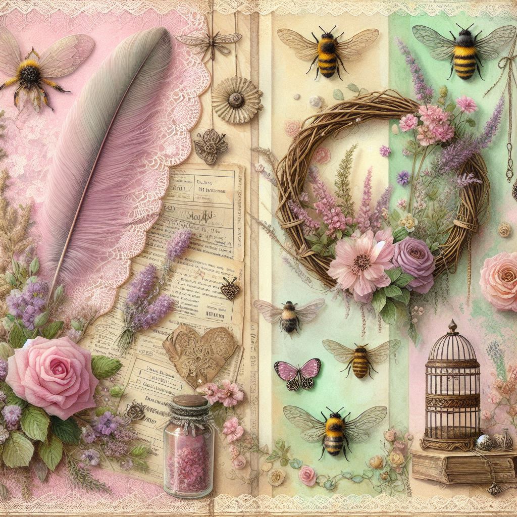 🌸 Élégance romantique : Une page en dentelle rose, agrémentée d’une plume, d’un journal vintage, de roses lavande et de potpourri délicat. 🌿 Nature en douceur : Une page crème au fond pastel aquarelle, mettant en scène un bouquet de fleurs sauvages et un nid d’oiseau dans un buisson. 🐝 Charme rustique : Une feuille d’étiquettes aux tons vert pâle et jaune, décorée d’abeilles réalistes et de ruches, encadrées par de fines brindilles. 🕊️ Ambiance victorienne : Une couronne de vigne sur un fond aquarelle pastel, avec une cage à oiseaux ancienne, des roses roses et de vieux journaux. Ajout subtil de papillons irisés pour une touche féérique.