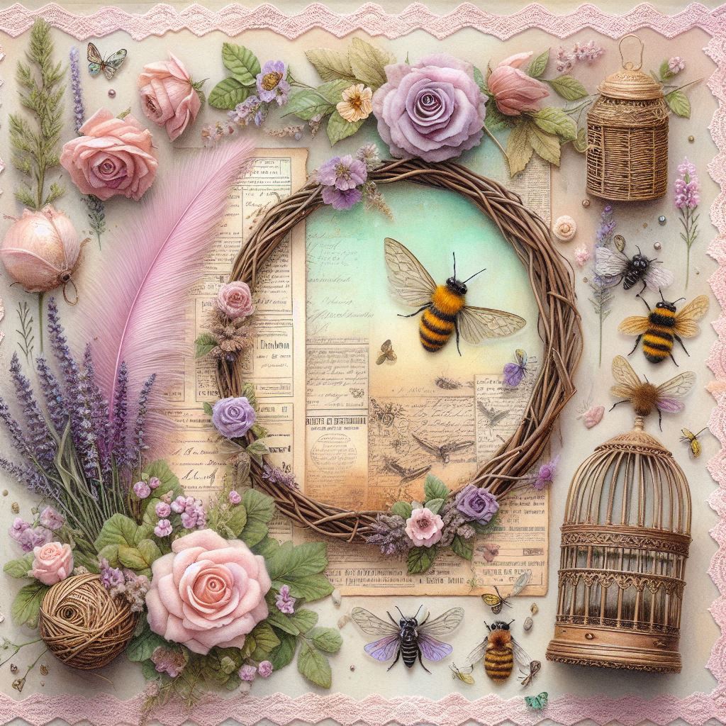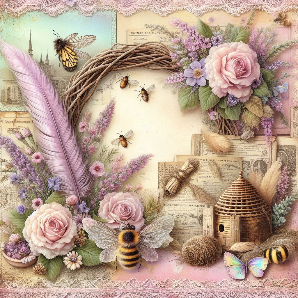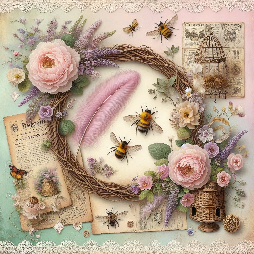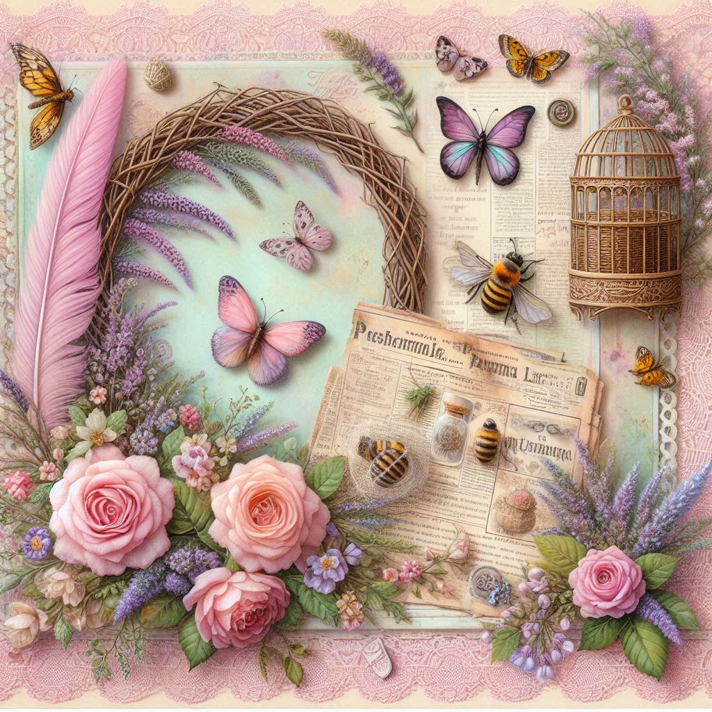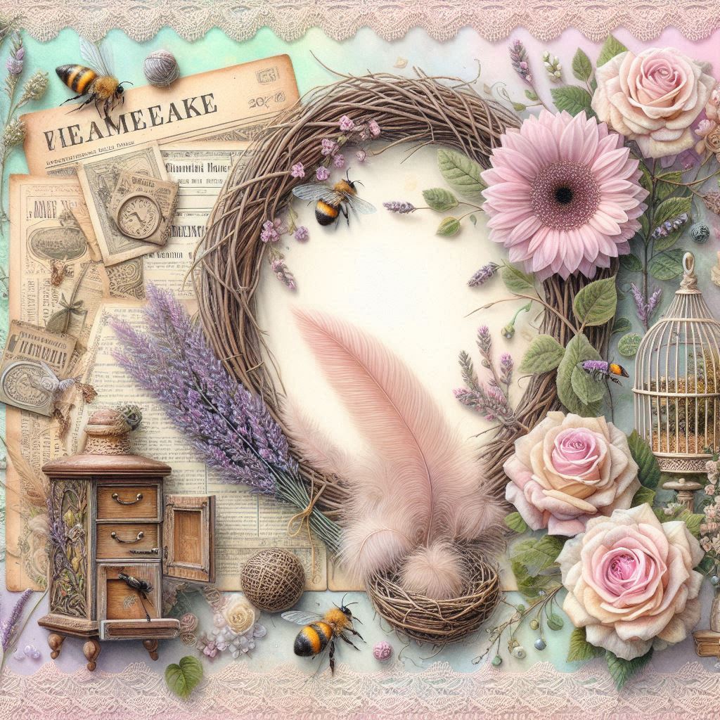 🌸 Élégance romantique : Une page en dentelle rose, agrémentée d’une plume, d’un journal vintage, de roses lavande et de potpourri délicat. 🌿 Nature en douceur : Une page crème au fond pastel aquarelle, mettant en scène un bouquet de fleurs sauvages et un nid d’oiseau dans un buisson. 🐝 Charme rustique : Une feuille d’étiquettes aux tons vert pâle et jaune, décorée d’abeilles réalistes et de ruches, encadrées par de fines brindilles. 🕊️ Ambiance victorienne : Une couronne de vigne sur un fond aquarelle pastel, avec une cage à oiseaux ancienne, des roses roses et de vieux journaux. Ajout subtil de papillons irisés pour une touche féérique.